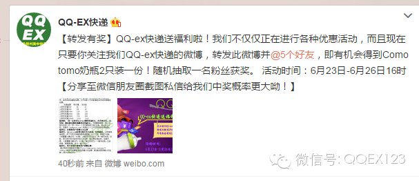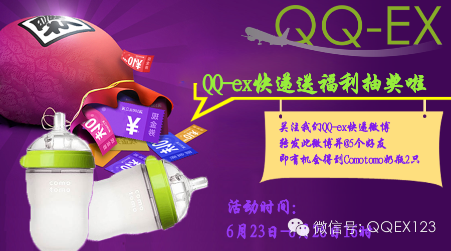 好消息又来啦!QQ-ex快递微博新一轮的活动模式开启啦!现在只要你关注我们QQ-ex快递的官方微博(微博号QQ-ex快递),转发下面微博并@5个好友,即有机会获得comotomo奶瓶一套(2只装)!