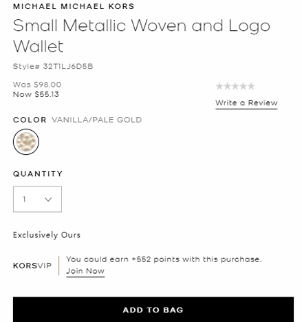 | 内容: | 网站需在境外网络环境下打开! Michael Kors美国官网这款Michael Kors Metallic Woven小号格纹钱包,售价降至56折$55.13,美国境内免邮; 美国境内免运费,需登录KORSVIP会员才能享受折扣(点击注册); 这款金属色编织钱包采用紧凑的环绕式拉链款式设计,饰有标志性印花,有多个卡槽和存放现金的空间。