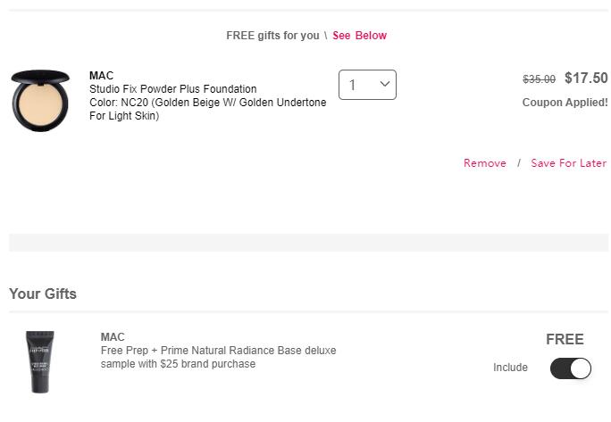 | 内容: | 网站需在境外网络环境下打开! ULTA美国官网的这款MAC Studio Fix柔雾干湿两用粉饼,售价$35,用码“MAC50”享额外5折优惠,折后价$17.5,满$35美国境内免运费; 买MAC满$25还赠送豪华妆前乳小样。 这款MAC Studio Fix柔雾干湿两用粉饼,既可以做定妆,也可以当粉底,哑光色自然,遮瑕力,磨皮效果和控油力都很不错。