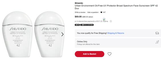 | 内容: | 网站需在境外网络环境下打开! Sephora美国官网上架了这款Shiseido资生堂白胖子防晒SPF 42 50ml*2支装,价值$96,售价$69,相当于7.18折力度。