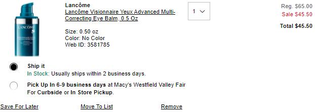 | 内容: | 网站需在境外网络环境下打开! Macys梅西百货这款Lancome兰蔻Visionnaire Yeux修复微整形精华眼霜,目前售价降至7折$45.5,美国境内满$25免邮; 另外还叠加最高满赠3重好礼(门槛降低)如下: -满$39.5赠菁纯6件套(抗衰、菁纯二选一); -满$80送眼唇卸3件套(蓝水、粉水二选一); -满$125送自选正装6.7oz一个(GALAT?E CONFORT温和卸妆乳、CR?ME RADIANCE柔肤洁面、MOUSSE RADIANCE洁面摩丝、MIEL EN MOUSSE蜂蜜卸妆?喱四选一); 主打功效:柔化眼周瑕疵;有效淡化黑眼圈和消除眼周皱纹; 使用感受:眼霜质地为白色的乳霜状,厚重度和普通面霜类似,延展性很好,摸起来有一点滑滑的感觉。因为是乳霜的质地,因此使用的时候先点按在眼周肌肤,再轻轻推开即可。膏体内部带有非常细腻的珠光,因此涂抹后就有很棒的提亮效果,能模糊黑眼圈。当做化妆前的眼部妆前乳最为适合。