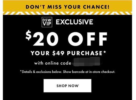 查看邮箱!DSW有部分会员可享$49立减$20优惠满额免邮