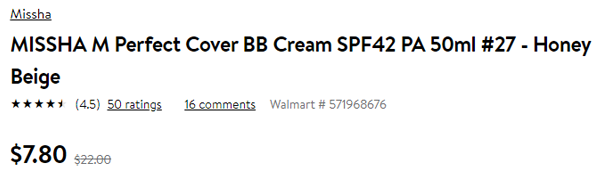 walmart这款Missha谜尚BB霜50ml,售价降至35折$7.8,满$35美国境内免运费,可凑单带回。