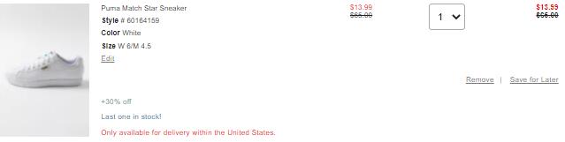 | 内容: | Urban Outfitters美国官网这款Puma Match Star 中性款小白鞋降价了,售价降至3折$19.99,加车还可叠加额外7折优惠,折后$13.99;目前W6/M4.5,W9/M7.5,W10/M8.5码有货;订单满$50免邮。 这款小白鞋是PUMA家非常经典的一款,简单时尚好搭配。