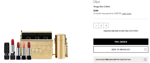 | 内容: | Saks Fifth Avenue目前上架DIOR迪奥2021年圣诞限定唇膏套装,售价$190;美国境内免运费,此款为预订款,预计10月17日以后发货。 Dior每年都期待的圣诞限定款都会配上一个包,今年直接上两个,各位刘亦菲们,动动美丽的手指,把两个精致的小包DIY改造成斜挎包。直接收获2个Dior大牌包包。2021年的圣诞限定主题是dior巴黎总部建筑,仔细看,包包外面还有建筑浮雕呢,精致本人了。套装依旧是烈焰蓝金口红,1支正装+3支替换芯+金色包包+口红链条包,色号分别是466,873,862,858, 基本秋冬都能hold住。