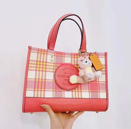 Coach工厂店官网这款Coach Dempsey 横版格子款托特包 粉/蓝色,售价降至3折$113.4,美国境内免邮。