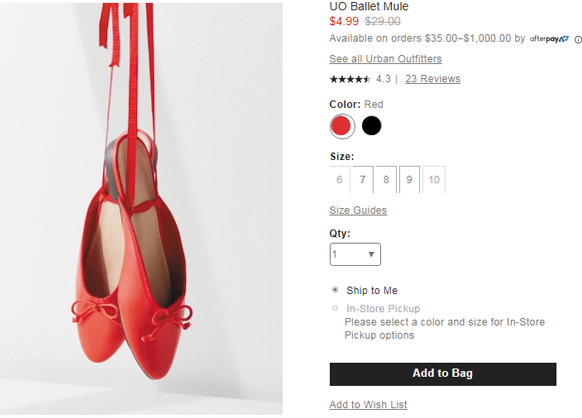 | 内容: | Urban Outfitters美国官网现有精选鞋履低至3.5折促销,无需用码,折后价显示在页面处; 这款UO Ballet Mule芭蕾舞鞋,清仓白菜价$4.99,美国境内满$50免邮;目前红黑2色可选,红色7-9码有货,黑色7-10码有货; 尖头绑带芭蕾舞鞋就像是王红一样的存在,好穿又好看,也许是芭蕾的原因,好像穿上整个人都要增添几分优雅的气息~