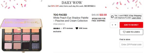 Sephora美国官网新一轮的美妆weekly wow大促现已开启,今天参加折扣的有这款too faced 白桃眼影盘,售价降至5折$22.5(约151元);