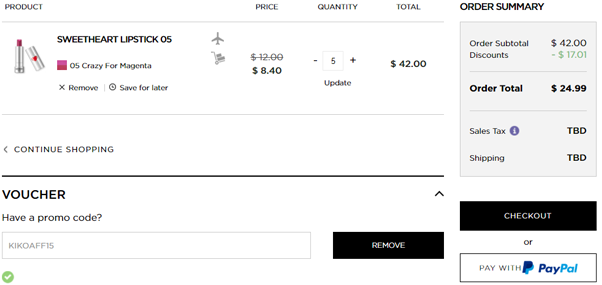 | 内容: | Kiko美国官网现有全场(部分商品不参加)满$40额外7折,无需用码,加入购物车自动折;另外还叠加无门槛85折优惠,需用码:KIKOAFF15; 这款KIKO 情人节爱心夹心唇膏热门的5号还有货,线上售价7折$8.4,凑单5支参加满$40额外7折优惠,用码“KIKOAFF15”最终每支折后价$4.998,约35元,相当于41折力度。订单满$15美国境内免运费。魔鬼李佳琦在视频中推荐的色号是3、5、6号色; KIKO情人节系列又来啦!这次一定要抢到爱心口红,还是夹心的哦!KIKO MILANO推出全新浪漫情人节系列Sweetheart,与您一起歌颂爱情。让您感受犹如爱情般的美妙感觉。拥有令人无法抗拒的质地,更富含森林水果香味。