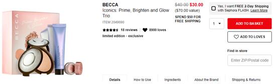 目前丝芙兰美国的这款becca Iconics彩妆套组,价值$70,现售价降至7.5折$30;