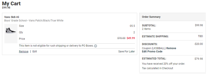 | 内容: | 目前Eastbay官网现有精选鞋服满$99额外8折促销,需用码“LKSBBALL”。 此款Vans 万斯 SK8-Hi 大童款高帮板鞋售价降至$49.99,可凑单参加满$99额外8折,加入购物车两双,用码“LKSBBALL”,每双折后$39.99,美国境内免邮,预计发货重三磅,转运到手约388元,目前Big 4.0/5.5/6.0/6.5/7.0码有货。 老牌潮鞋 Vans 坚持了几十年的街头平价路线,他们家板鞋一直都广受明星潮人喜爱。它家除了 Old Skool 之外,这双 SK8 也是招牌的经典版型!无论平时走的是街头酷风还是甜美小清新风,只要一双它,就可以提升整体造型的时髦度,这款经典黑白无需多说,街拍出镜率爆高。