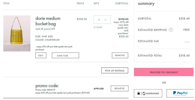 | 内容: | Kate spade美国官网母亲节全场正价服饰鞋包额外8折促销,优惠码:“MDAY19”; 参加活动商品页面标有“special offer enjoy 20% off your kate spade new york purchase!” 部分商品不参加,以加入购物车为准; 美国境内免运费,促销有效期至北京时间2019年5月14日中午; 来自美国纽约的时尚品牌的kate spade 凯特?丝蓓,主要生产手提包、鞋子等,以简约靓丽的设计深受女性喜爱,同时它也是这几年在各大时装杂志频繁亮相的时尚新宠。