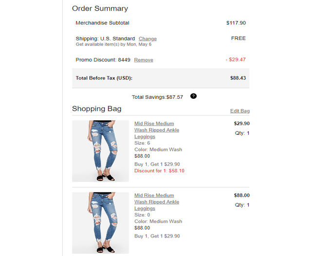 | 内容: | 目前Express官网现有全场服饰满$100享7.5折优惠,需用码“8449”; 另有折扣区第二件低至3.4折促销,无需用码,加入购物车两件价格直接显示,并可叠加满$100享7.5折的促销活动; 部分商品不参加,以加入购物车为主; 订单满$50美国境内免邮; 活动日期未注明,随时可能结束;