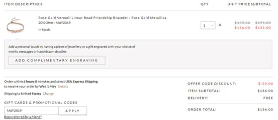 | 内容: | Monica Vinader美国官网母亲节全场无门槛额外8折+免费刻字,需使用折扣码:“MAY2019”; 美国境内免运费,可以选择中国区下单,不过价格是含税的价格会偏贵,建议选择美国区,走转运带回,合适入手; 实测如果使用英镑结账汇率差更合适,网站提供免费刻字服务; 促销有效期至北京时间2019年5月6日中午; Monica Vinader 是来自英国的珠宝轻奢品牌!它家最火的得属大名鼎鼎的友谊手链,突破传统红绳的设计,简洁百搭,更显品味,大表姐刘雯也是他们家的忠实粉丝,在许公众场合中,都不难发现这个牌子的身影,从品牌一推出,就引起了名媛圈明星圈的轰动,Emma Watson 、Olivia Palermo,KendallJenner,刘雯和凯特王妃都是它家忠粉。