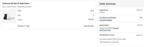 | 内容: | 目前目前Eastbay官网现有阶梯折扣促销活动,无门槛8.5折,需用码“LKSSP15”,满$99享8折,需用码“LKSSP20”,满$199享7.5折,需用码“LKSSP25”; 这款Converse匡威 All Star Hi Seek Peace大童款板鞋,售价$45,还可叠加满$199额外7.5折促销,用码“LKSSP25”,加入购物车5双,每双折后价$33.75,美国境内免邮,预估发货重量2磅,转运到手约311元,目前Big 3.5码有货; Converse 匡威家的 All Star 算是非常经典的常青款啦,时至今日街拍里甚至街上也依然可以见到它的身影,足以毫不费力说明它的百搭能力。