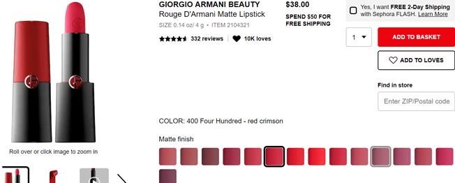 | 内容: | 目前丝芙兰美国的此款Giorgio Armani新款哑光唇膏 400有货,售价$38,目前VIBR会员还可用码“HEYROUGE”享8折优惠,折后$30.4;