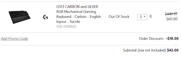 | 内容: | Logitech 现有G513 RGB 类茶轴 机械游戏键盘,Tactile色使用折扣码“6ohj7tdxx”,买一个10%,两个20%,三个30%,3只键盘仅需$42,目前显示sold out但可以加购物车结账。 订单满$29美国境内免运费。