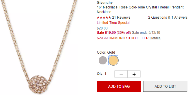 | 内容: | Macy's梅西百货的这款Givenchy纪梵希火球玫瑰金锁骨链金色,售价降至7折$19.6,两色都有,有需要的可入; 订单满$75美国境内免运费,适合凑单带回,优惠至北京时间5月13日下午15点; 这款纪梵希许愿球玫瑰金锁骨链,带有施华洛世奇元素,链子带有3个搭扣,可调节选择佩戴长度。 网友提醒,近期梅西百货砍单比例提高,一般不通过就是秒砍,要是能够收到确认邮件基本就安全,如果账号近期出现砍单大概率最近都没法下单,建议大家试试吧,或者找人代刷;