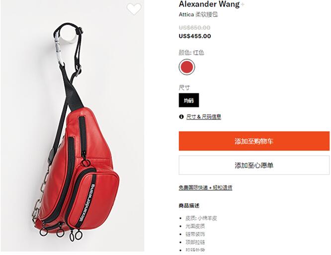 | 内容: | shopbop官网的这款Alexander Wang Attica大王腰包 ,现7折特价$455(约93094元),美国境内免运费。 另外,满100刀免费直邮中国,确定订单的时候如果是默认的发货方式需预缴税费,记得要在“发货方式”处选择第三种有“免费可追踪国际邮政快递”字样的运输方式。顺利清关国际快递已升级,715美金以下的单品,下单收取9.1%的税率,仅支持支付宝; Alexander wang大王腰包可以说是当下最火的腰包单品,这款Alexander Wang Attica大王腰包红色款采用小羊皮光面制成,多明星如新兴超模KAIA格柏等都曾背过这款包包,可背可拎可斜跨,确实时髦又好看。并且相比经典的黑色机车腰包,这款红色的更活泼大胆,适合春夏背。