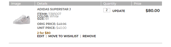 | 内容: | 目前Jimmy Jazz网站现有Adidas 阿迪达斯 originals 系列 Superstar 大童款板鞋 粉镭射售价降至$49.96,可参加买两双$80活动,加入购物车两双,每双折后价$40,美国境内运费$7.95起,注册会员结账有机会享受美国境内免邮,预计发货重2磅,加运费转运到手约401元,目前Big 5Y-7Y码有货; 三叶草的 Superstar 这几年是有多火想必都不用说了,除了大热的黑白配色之外,这款粉镭射其实也还不错哦!经典的贝壳头、侧边三条杠和三叶草的鞋标,百搭程度非常高。粉镭射相对于热门的镭射款更加低调,blingbling 的感觉不会太重,更加适合日常。现在特价中,黄金码还有部分,喜欢的可以下手。