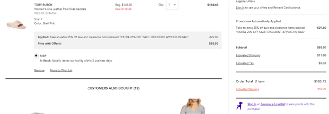 | 内容: | Bloomingdales现有精选时尚类商品额外7.5折促销,无需使用折扣码,加入购物车显示折扣价; FULA、Rebecca Minkoff、MICHAEL Michael Kors、Coach等多个品牌都有参加,参加活动的商品页面标注:“EXTRA 25% OFF SALE: DISCOUNT APPLIED IN BAG”; 另有全场正价美妆护肤品满$250立减$25、满$500立减$50、满$1000立减$150,无需折扣码,满额自动减;详情点击>>> 有效期至北京时间 2019年05月17日下午; 美妆护肤类满$150美国境内免运费,或者Loyallist免运费(可免费加入Loyallist program), 结账时输入Loyalist ID即可。 很多州没有消费税(除了AZ, CA, FL, GA, HI, IL, MD, MA, NJ, NY, PA, VA,WA),无税州下单时,在超后一步点击"submit"后,消费税会变为$0。