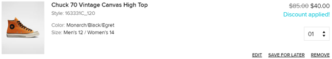 | 内容: | Converse官网精选Vintage系列帆布鞋一律$40促销,需用码“VNTG40”; 加入网站的会员(免费加入)美国境内免运费,非会员满$50免邮; 活动日期未注明,随时可能停止; 这一系列有丢丢复古韵味,鞋身是纯色打造,看起来更加干净自然,水洗帆布简约大方,受到大众喜爱。