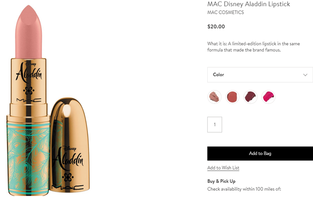 | 内容: | 评论 网站需在境外网络环境下打开! 目前Nordstrom网站上架了这款MAC 迪士尼限量版 子弹头唇膏,售价$20; 网站购美妆护肤满$175赠价值$178的超值护肤礼包,满$200加赠护肤3件套礼包,满额自动加车; 美国境内免邮,结账自选3小样,点击页面自选:http://t.cn/EAGjUlu 迪士尼真人版电影《阿拉丁》即将上映,而M.A.C也搭配推出全新的《阿拉丁》主题限量彩妆系列,从资深彩妆师dominic_mua曝光的照片可看到,全系列包括:裸色和金属色调的眼影盘、打亮粉饼以及唇膏,包装上印有浓浓中东风情的的图腾,迫不及待想拥有啊~