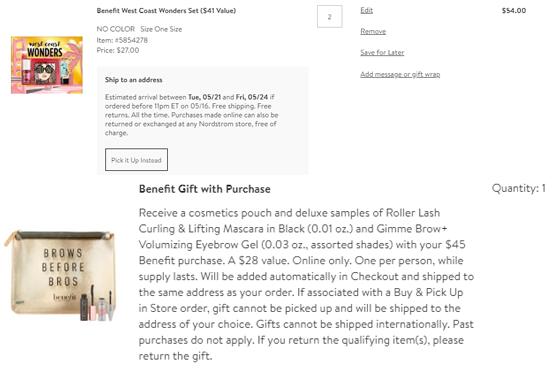 | 内容: | Nordstrom官网现上架了这款Benefit Cosmetics腮红脸部彩妆系列套装(价值$41),现售价$27,还有三重满赠: 1、网站购贝玲妃满$45送价值$28的睫毛膏+染眉膏套组,满额自动加车; 2、网站购美妆护肤满$175赠价值$178的超值护肤礼包,满鹅自动加车; 3、网站购美妆护肤满$200加赠护肤3件套礼包,满鹅自动加车; 美国境内免邮,结账自选3小样,点击页面自选:http://t.cn/EAGjUlu 套装包含3款mini装产品,分别为反恐精英妆前、红粉菲菲唇颊露、GALifornia 阳光金粉腮红,如下图所示: