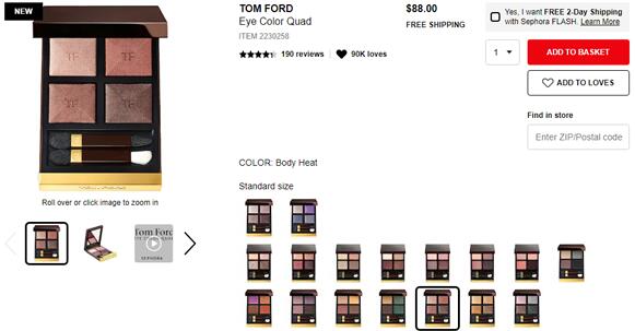 Sephora美国官网的这款Tom Ford新品四色眼影body heat补货,售价$88,暂时没有额外折扣;