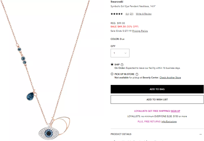 | 内容: | Bloomingdales现有精选施华洛世奇饰品5折促销,折后价直接显示在页面; 这款Swarovski施华洛世奇 恶魔之眼金色锁骨项链,目前售价降至5折$49.5,海淘低价!美国境内免邮; 订单满 $150包邮, 或者Loyallist免运费(可免费加入Loyallist program), 结账时输入Loyalist ID即可。 结算输入免税州邮编后消费税自动消失; 这款融入多种镀层的Duo Evil Eye链坠,是由米兰达 可儿(Miranda Kerr)与施华洛世奇携手创作,可为装扮增添神秘点缀。链坠的两枚恶魔之眼装饰分别以密镶蓝色、黑色和透明仿水晶,及镀玫瑰金色金属精心打造,并搭配一条饰有深蓝色仿水晶的镀玫瑰金色饰链。