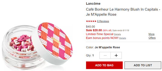 | 内容: | Macy's梅西百货的这款Lancome兰蔻 19春季限定字母腮红,现价降至5折$20;订单满$75美国境内免运费; 网友提醒,近期梅西百货砍单比例提高,一般不通过就是秒砍,要是能够收到确认邮件基本就安全,如果账号近期出现砍单大概率最近都没法下单,建议大家试试吧,或者找人代刷。 Lancome (兰蔻) 2019咖啡糖果春季彩妆系列所推出的独一款字母腮红盒。这种大胆的设计以大写字母“LANCOME”的形象出现,灵感来源于陈设于巴黎咖啡馆里的小椅子。淡淡的粉色,搭配上淡淡的闪。瞬间营造好气色和飘逸的妆效。是追求仙女妆的不二之选。