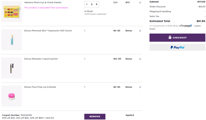 | 内容: | Tarte美国官网现有现有全场彩妆满$40额外8折、满$60额外7.5折、满$80额外7折促销,需使用优惠码:“WEEKEND”; 另外,网站购物满$60还送3小样,满额自动加车,结账还可自选2片片小样,购物车自选即可; 个别商品不参加,以加入购物车为准; 美国境内满$25免邮,活动时间未注明; Tarte 彩妆主打纯自然养肤彩妆,招牌的成分是亚马逊黏土,不伤皮肤,持久显色。它家的明星产品是亚马逊黏土腮红和亚马逊黏土粉底。 这个网站海淘不算友好,建议多多尝试下单;