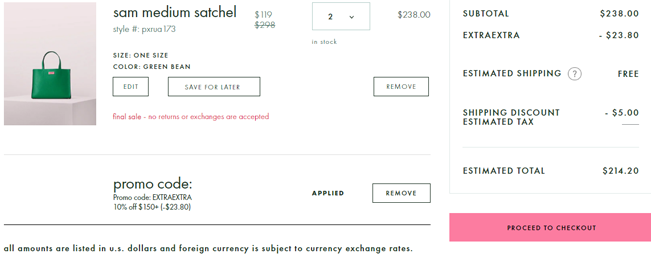 | 内容: | Kate spade美国官网精选服饰鞋包低至2.5折促销,无需用码,折后价显示在页面处; 另外还可叠加满$150额外9折优惠,优惠码:“EXTRAEXTRA”; 美国境内免运费,活动随和可能截止; 来自美国纽约的时尚品牌的kate spade 凯特?丝蓓,主要生产手提包、鞋子等,以简约靓丽的设计深受女性喜爱,同时它也是这几年在各大时装杂志频繁亮相的时尚新宠。