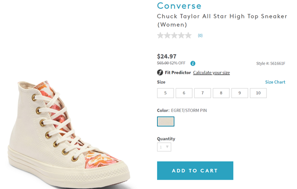 | 内容: | Nordstrom Rack的这款Converse匡威Chuck all star花卉印花高帮女款休闲鞋,售价降至38折$24.97,订单满$100美国境内免邮,预估发货重量2磅,凑单转运到手约255元,目前女士5-10码有货。 网站海淘下单有一定难度,建议大家多多尝试。 Converse 匡威家的 All Star 算是非常经典的常青款啦,时至今日街拍里甚至街上也依然可以见到它的身影,足以毫不费力说明它的百搭能力。