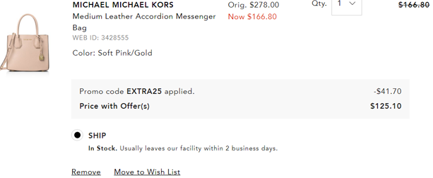 | 内容: | Bloomingdales现有精选时尚类额外7.5折促销,需用码:“EXTRA25”;Michael Kors专区直达>>> 其中这款Michael Kors Mercer 系列中号粉拼风琴包,目前售价直接降至$166.8,叠加以上此码享额外7.5折,折后$125.1;目前还有珍珠灰和橄榄绿另外2色可选;美国境内免邮,预计发货重量3磅,转运到手约980元; 订单满 $150包邮, 或者Loyallist免运费(可免费加入Loyallist program), 结账时输入Loyalist ID即可。 结算输入免税州邮编后消费税自动消失; 这款Mercer手袋造型简约,选用了精巧的锁扣,使包袋既低调又有质感。外层选用了荔枝纹牛皮,内部是PVC压印十字纹,使包袋拥有柔和而挺阔的外型,整体轻巧便于携带。活泼之余又不失稳重。内置的拉链口袋可以轻松容纳个人物品。