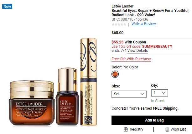 | 内容: | Belk网站现有全场正价美妆护肤无门槛85折,需用码:SUMMERBEAUTY;Estée Lauder 雅诗兰黛,科颜氏,Lancome 兰蔻,Bobbi Brown 芭比波朗,Dior 迪奥等都参加,还可叠加各品牌满赠,有需要的可入; 这款雅诗兰黛 小棕瓶限量护肤三件套现价$65,价值90美金,使用85折码后$55.25(约387元); 套装包括:正装小棕瓶眼霜0.5oz;旅行装小棕瓶精华0.24oz;浓密睫毛膏0.1oz,相当于买眼霜送旅行装小棕瓶和睫毛膏!