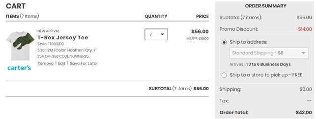 | 内容: | Carters卡特现有精选新到儿童夏季童装商品低至5折促销,不少新品上市后刷新最低价!无需用码,折后价显示在商品页; 现还可叠加满$50额外7.5折优惠,需用码:“summer25” 注:clearance, doorbusters, Skip Hop等商品不叠加额外折扣,以购物车显示为准; OshKosh BGosh姐妹网同步此活动,链接直达>>> 目前美国境内满$35免邮; 活动截止到北京时间7月10日下午15点左右。