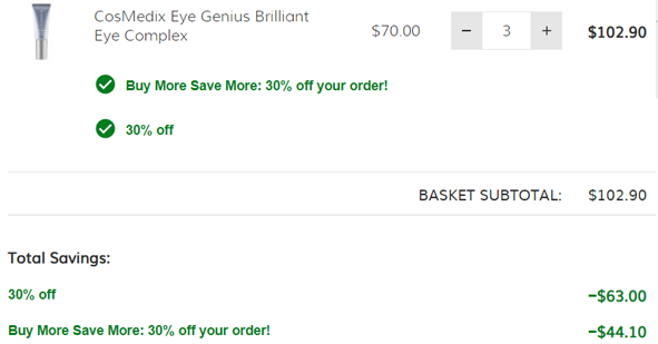 | 内容: | 评论 SkinCareRx现有CosMedix高浓度多功效眼霜 7ml,原价$70,加入购物车立享7折,凑单3件用码:“SAVE”还可再享7折,折后$34.3,相当于4.9折; 网站折后满$150送自选小样,满额购物车自选即可; CosMedix紧致眼霜,质地很细腻,滋润度极高,有着出色的修复性,容易吸收,去细纹,黑眼圈,舒缓镇定眼部浮肿都有不错的口碑。适合任何肤质哦。