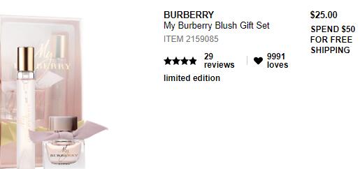 目前Sephora美国官网Burberry巴宝莉 女士花之绯蝴蝶结香水套装有货,售价$25(约175元);满$50免美国运费。