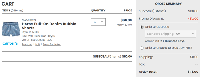 | 内容: | 评论 Carters卡特现有精选新到儿童夏季童装商品低至5折促销,不少新品上市后刷新最低价!无需用码,折后价显示在商品页; 现还可叠加满$50额外8折优惠,需用码:“extra20”,不如前几天7.5折合适,刚需折; 注:clearance, doorbusters, Skip Hop等商品不叠加额外折扣,以购物车显示为准; OshKosh BGosh姐妹网同步此活动,链接直达>>> 目前美国境内满$35免邮; 活动截止时间未注明。