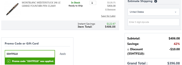 | 内容: | 目前Jomashop网站现有MONTBLANC 万宝龙 Le Grand 大班系列 p146 F尖钢笔,售价降至$406.08,还可用码:“55HTFS10”叠加满$150立减$10优惠,折后$396.08,订单满$100美国境内免邮,转运到手约2780元; 这款大班系列是万宝龙钢笔的经典系列,其造型被多个品牌模仿,该系列量产旗舰型号为149(笔尖多为18k),146(笔尖多为14k)次之,2014年开始笔尖使用新标,就是k金含量的表述方式不同,本质无区别。每种型号都有14*和p14*两款,不带p的为黄色镀金笔夹,带p的为白色镀铂金笔夹,带p的价格一般要贵几百元。这两种型号都是活塞上墨系统,对于日常书写来说,149尺寸会偏大,146的大小会更适合。笔尖粗细常见的是m(中,签名常用),喜欢细点的可选择f(细,其实也不是很细),实际粗细相当于中性笔0.5和0.7的差别。