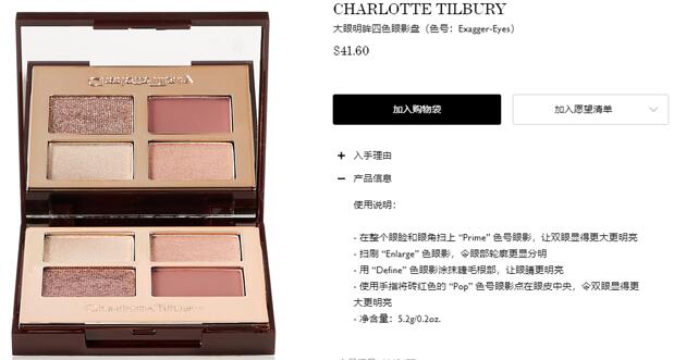 | 标题: | Charlotte Tilbury四色眼影盘 Exaggereyes色售价$41.6,相当于官网79折 |