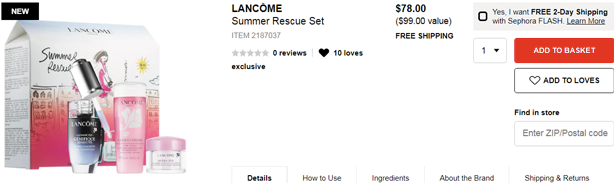 目前丝芙兰美国官网上架的这款LANC?ME兰蔻Summer Rescue套装(价值$99),售价$78,约538元;