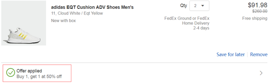 | 内容: | eBay阿迪达斯旗舰店现有精选运动鞋服第二件半价促销,无需用码,加入购物显示折后价; 另外,ebay有全场单一卖家结算商品满$88减$15,需使用折扣码“PCN163YH”,价格做到更低。 美国境内免邮;促销活动随时可能结束。 相信每个人的鞋柜里都有一款跑鞋,不管是平时健身、出门旅行或是日常工作都能运用自如,现在活动专区内多款跑鞋促销,也有不少昔日爆款,喜欢的朋友可以进场逛逛啦!