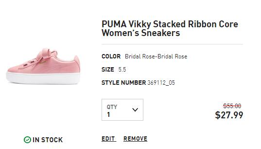 | 内容: | 目前Puma美国站现有精选商品额外7折促销,需用码:PUMA30;专区直达>>> 其中这款Puma彪马Vikky Ribbon蕾哈娜蝴蝶结厚底松糕鞋,售价降至$39.99,用码实付$27.99,美国境内免邮,转运到手约276元,目前粉色、黑色女士5.5码起有货。 潇洒利落的流线型剪裁,搭配蝴蝶结更加甜美活泼,浓浓的少女感,不管是做运动还是日常穿搭完全轻松get。