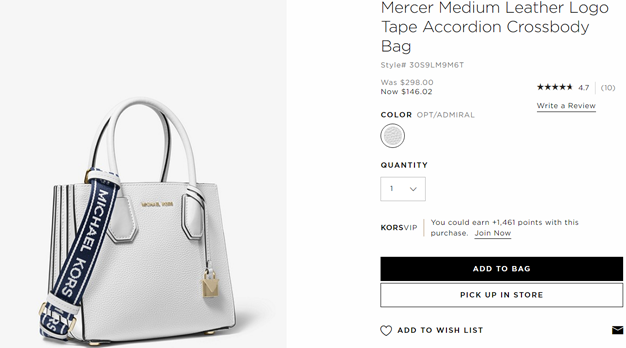 | 内容: | 网站需在境外网络环境下打开! 目前Michael Kors美国官网低至3折大促还在进行,其中这款Michael Kors Mercer Logo背带锁头中号风琴包,目前售价折价降至4.9折$146.02,比之前额外7.5折价格要好,美国境内免邮,预计发货重量3磅,转运到手约1110元,目前仅白色款有货。 美国境内免运费,需登录KORSVIP会员才能享受折扣(点击注册); Mercer 可以说是被杨幂彻底背火了,方方正正的一个小包,无论什么风格的衣服都轻松好搭;荔枝纹皮革,质感好,更耐磨;金色的装饰吊锁低调又显气质;这款是全新配色,纯白底色与边缘处的黑色交接,搭配近年流行的蓝色字母LOGO背带,优雅中又不失潮流感。看腻了街上的纯色款,入一只这个也是不错的哦!
