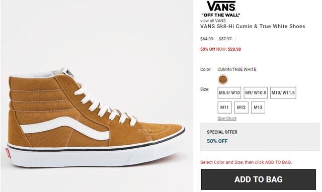 | 标题: | Vans SK8-Hi高帮姜黄色帆布鞋售价$28.98 |