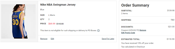 | 内容: | Eastbay美国官网的这款Nike金州勇士NBA库里30号男款球衣,售价降至63折$69.99,还叠加满$75额外85折优惠,需用码:LKSJUL15;凑单2件,用码每件折后价$59.49,约415元。美国境内免邮,目前男士S、L码起有货。 今年的篮球背心大热 ,很多妹子开始尝试oversize的球衣,在这里给大家推荐一款库里30号蓝色球服,很适合夏天这么炎热的天穿哦。内搭白色T恤,或者搭配裹胸,这样会更清凉。