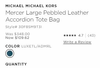 | 内容: | Michael Kors官网这款MICHAEL Michael Kors Mercer大号风琴包 孔雀蓝,目前售价降至3.2折$109.62,美国境内免邮,预计发货重量4磅,转运到手约927元; 美国境内免运费,需登录KORSVIP会员才能享受折扣(点击注册); 网站支持国卡+转运。不过有一定的砍单几率。