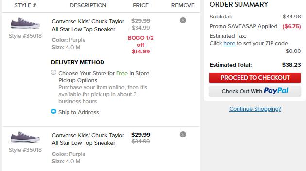 | 内容: | Famous Footwear官网现有全场鞋履买一件第二件半价促销,加入购物车显示折后价;专区直达>>> 另有还叠加额外85折码“SAVEASAP”,折后价格更低; 其中这款Converse 匡威 Chuck Taylor All Star 低帮大童款帆布鞋 魔芋紫,售价$29.99,加入购物车2双,用码每双折后价$19.15,会员美国境内免邮,转运到手约215元,目前大童us big4、6码都有货,可以凑单一起带回。 Converse 匡威家的 All Star 算是非常经典的常青款啦,时至今日街拍里甚至街上也依然可以见到它的身影,足以毫不费力说明它的百搭能力。